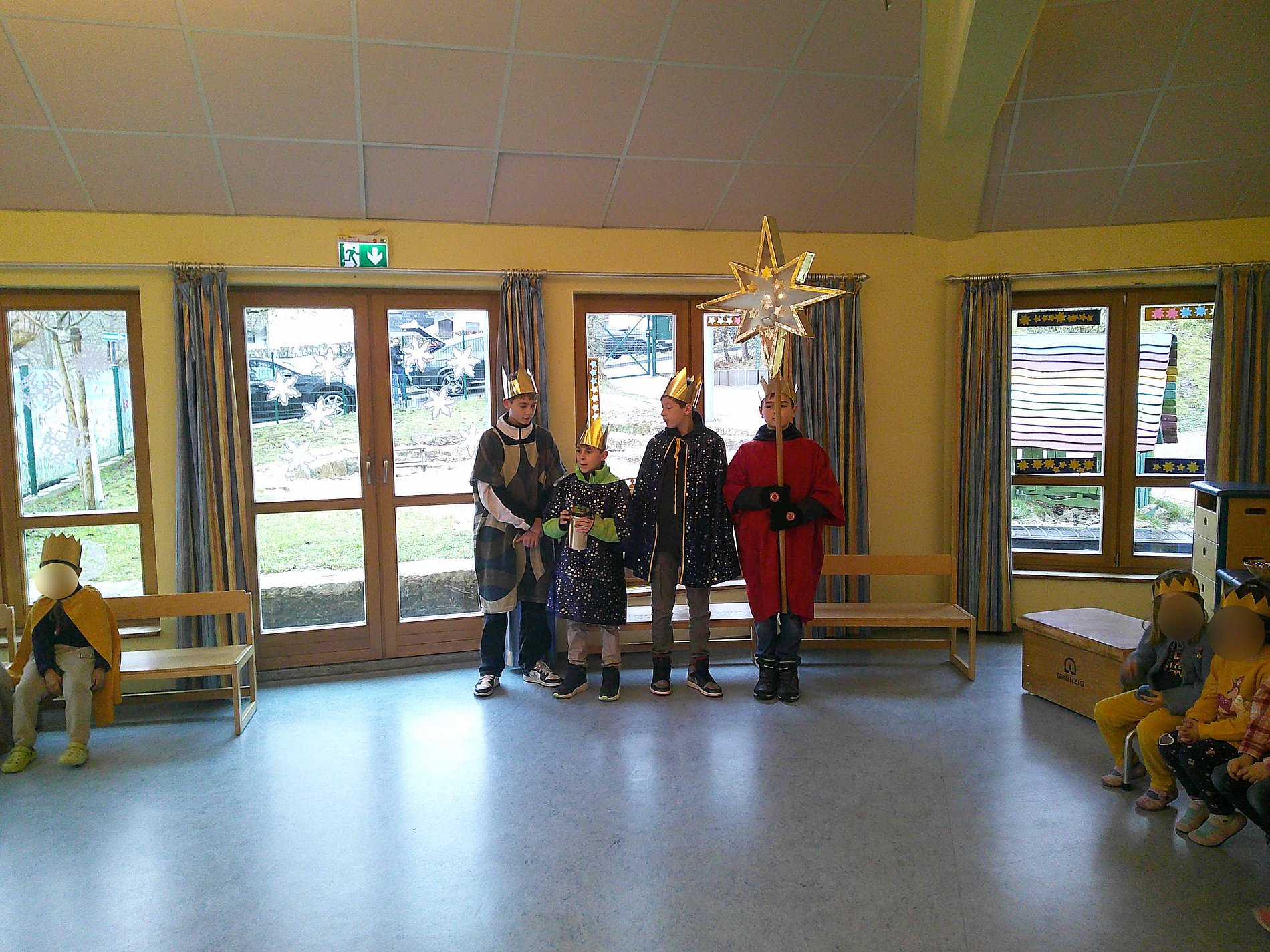 Gleich vier “Heilige drei Könige” singen ihr Lied und erzählen ihre Geschichte. Die Kinder des Kindergarten Eden singen “Die Könige aus dem Morgenland, die haben den Stern gesehen und machen sich auf den weiten Weg, um zu dem Kind zu gehen ….”