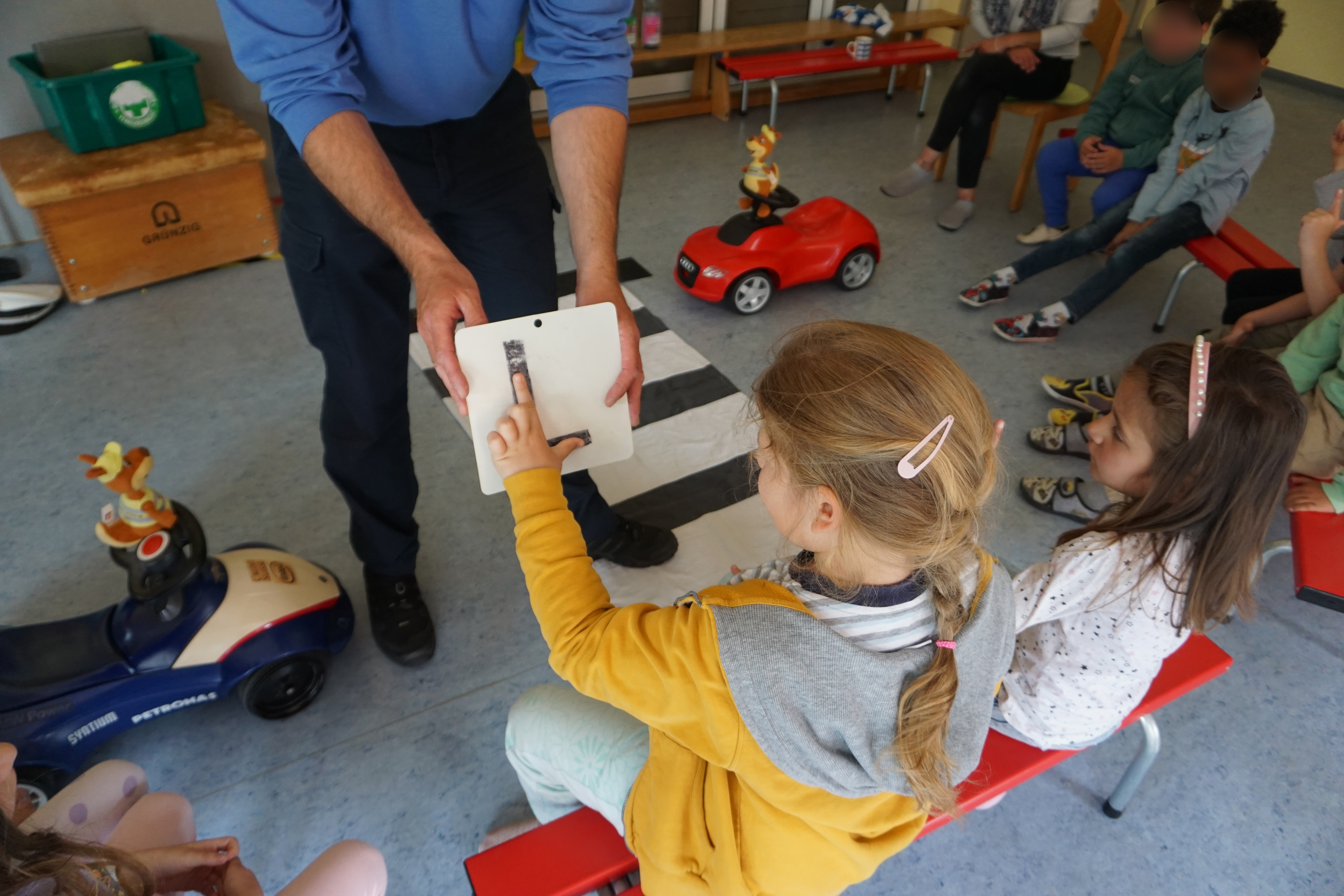 Ralf stellte seine Überraschungskiste vor. Zunächst lernten die Kinder seine Kuscheldecke kennen. Oder was ist es tatsächlich? Die Kinder überlegten gemeinsam. Sie vermuteten einen Teppich, ein Handtuch. Nein – es ist ein Zebrastreifen. Die Kinder bauten diesen auf und platzierten am Anfang der Matte eine Bordsteinkante. “Was ist die Bordsteinkante?” “Der Bordstein ist da wo die Leute drauf laufen. Da wo die Kante ist, ist er zu Ende. Dort beginnt die Straße.”