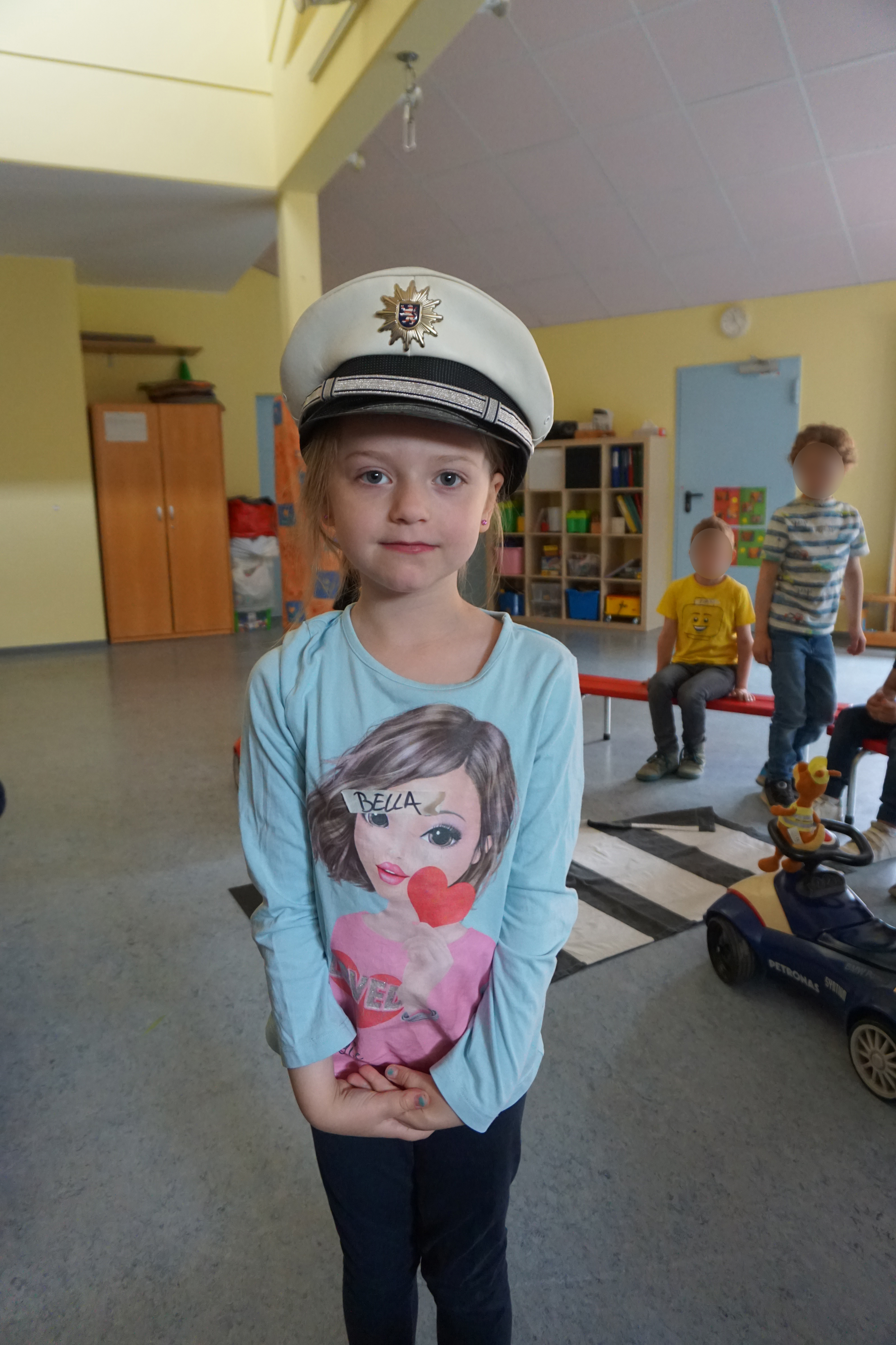 Polizist Ralf Bentert stellte sich der Kindergruppe vor und bot allen das „Du“ an. Zuerst erklärte er seine Uniform. Jedes Kind durfte die Polizeimütze tragen. Die Schulterplatten mit den silbernen Sternen erkannten die Kinder direkt und wollten Genaueres darüber erfahren. “Warum sind das sechs Sterne? Was bedeutet das Wappen auf dem Arm?”