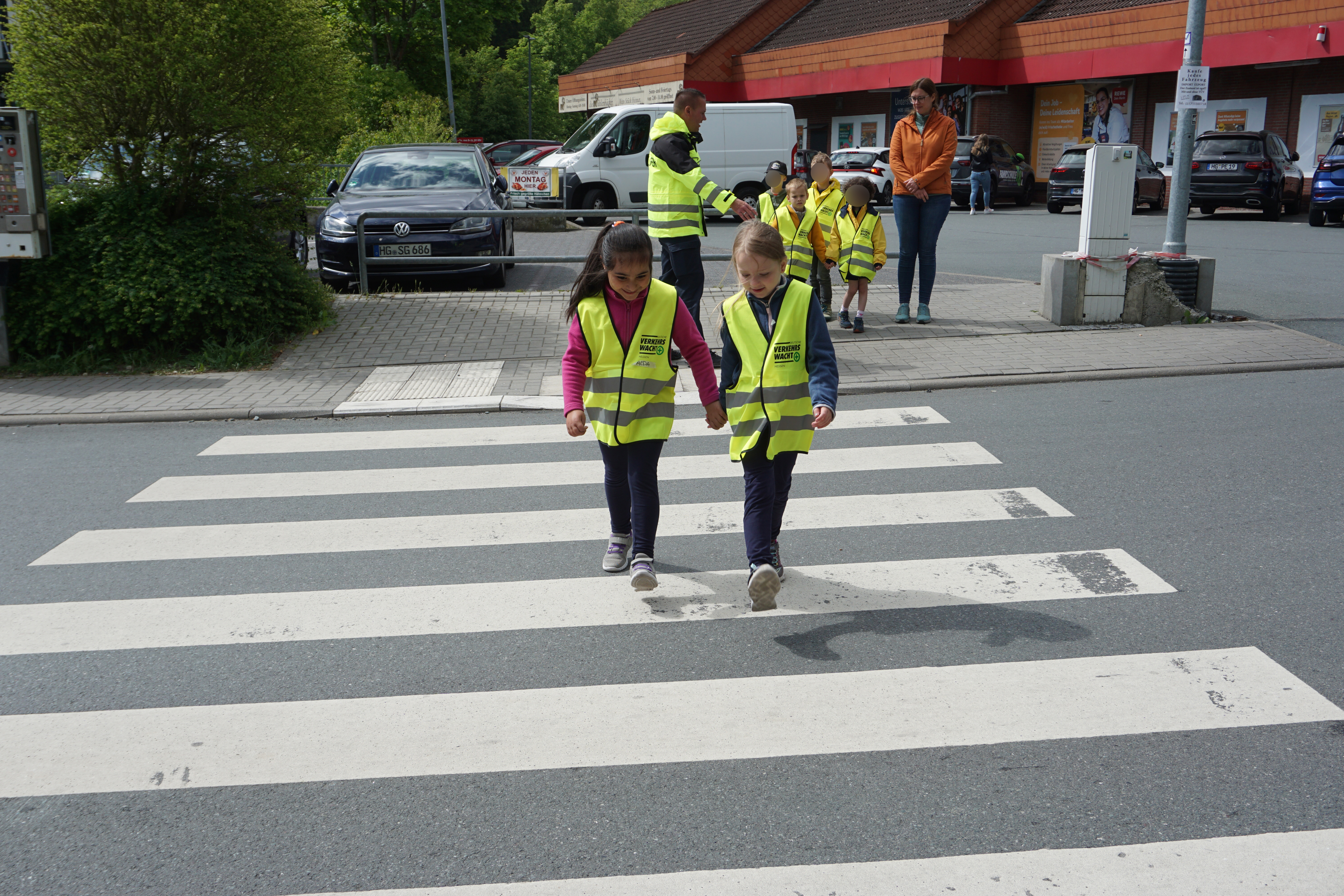 Die Kinder trugen die geschenkten Warnwesten und übten ihr theoretisches Wissen in der Praxis. Sie liefen direkt den von der Gemeinde ausgewiesenen Schulweg vom Kindergarten Parkstraße, Freseniusstraße, Seelenbergerstraße bis zur Schule. Zuerst kam der Zebrastreifen beim Getränkemarkt. Hier zeigte sich ein hohes Verkehrsaufkommen. Die Kinder wandten ihr Wissen an und versuchten den Fahrern der nahenden Busse, Bagger, Lkws, Autos, Motorräder durch Blicke zu vermitteln, dass sie über den Zebrastreifen gehen möchten. In zweier Teams übten wir dies ebenfalls beim Zebrastreifen Schillerstraße (Wick, Kirche), sowie auch bei dem Zebrastreifen an der Kanonenstraße. Die Kinder waren aufgeregt und nervös. Es war zu beobachten, dass die Autofahrer sich ungeduldig zeigten. Die Autos wollten nicht zum Stehen kommen, sondern rollten zu dem Zebrastreifen – dies verunsicherte die Kinder zusehends. Eine Dame fuhr dennoch über den Zebrastreifen ohne Rücksicht auf die Kinder und Erwachsenen.